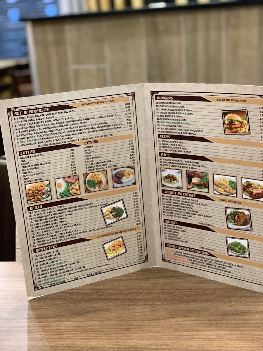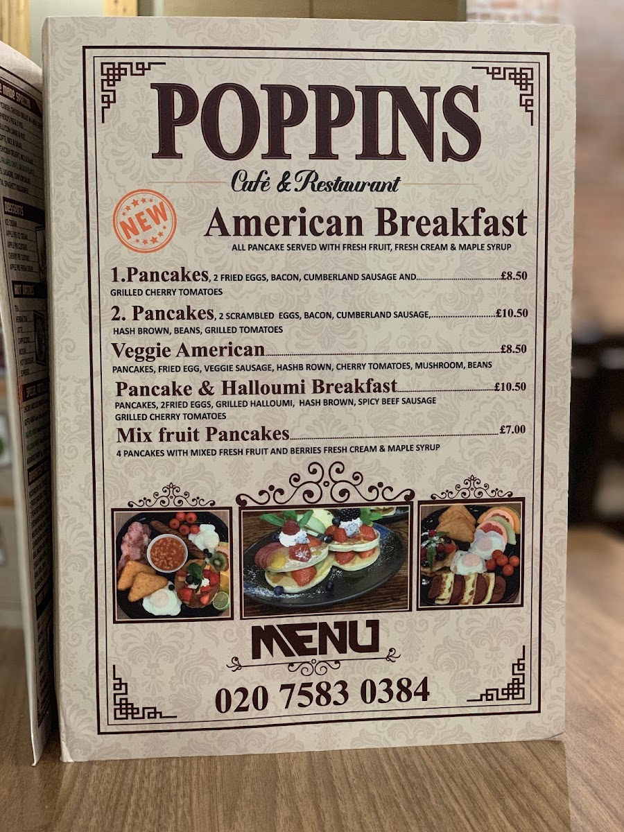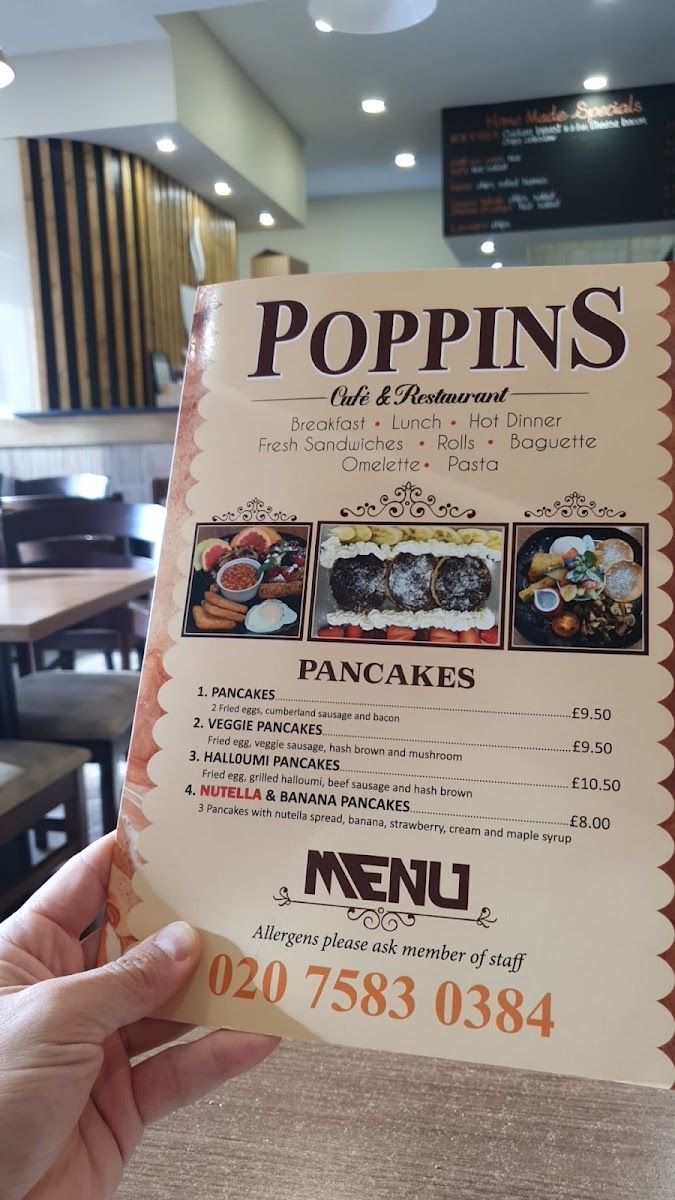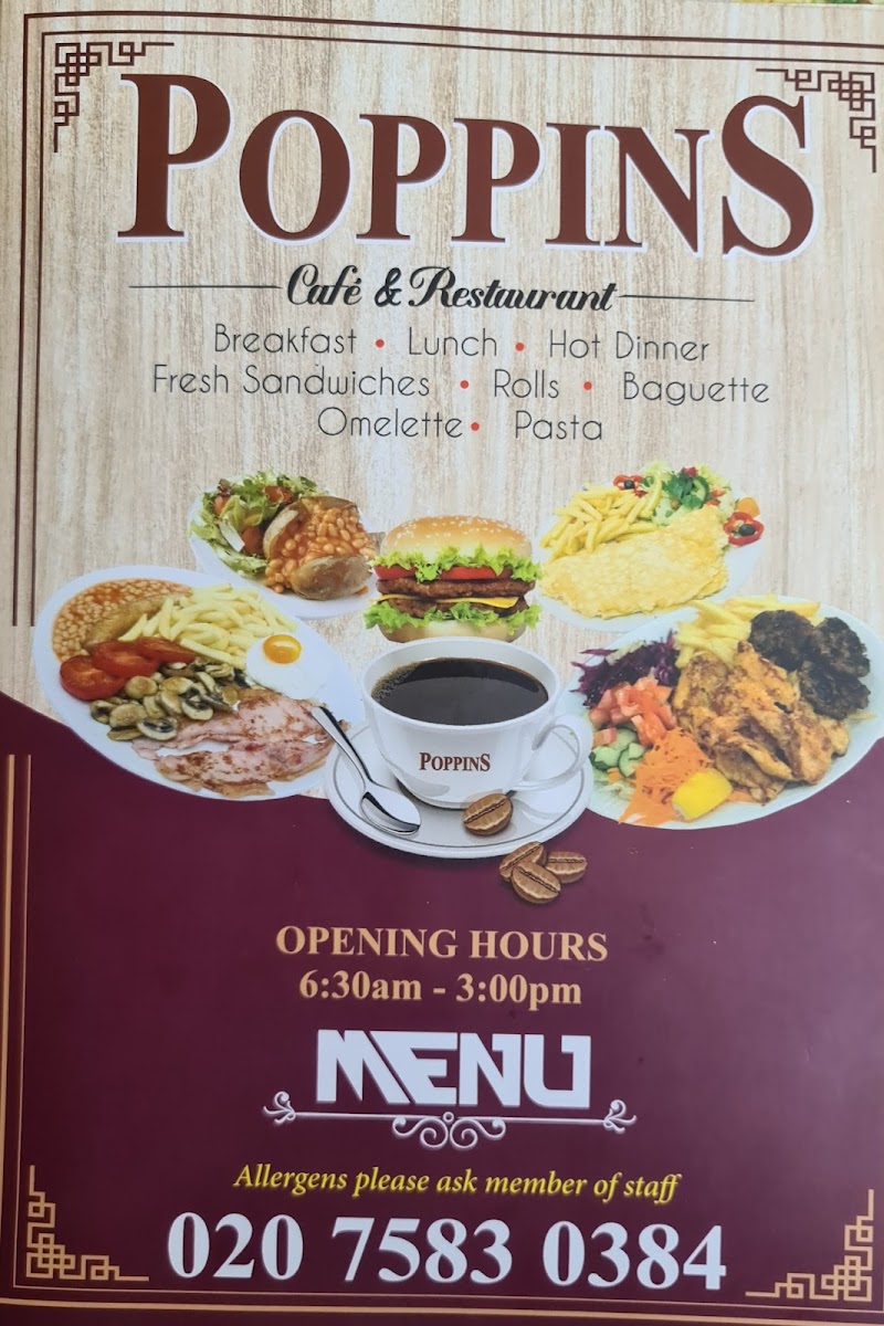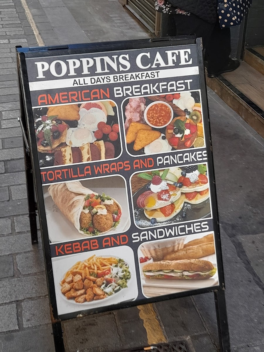 Poppins Cafe at 4 Poppin's Ct in London offers a menu that is both comforting and delightfully varied, catering to classic British tastes with a few modern twists. The burger selection is generous, featuring Hamburger & Chips, Cheese Burger & Chips, Large Cheese Burger & Chips, Cheese Bacon Burger & Chips, and Egg Burger & Chips, each promising hearty portions. Seafood lovers will enjoy the Scampi, Chips & Peas, Fried Cod, Chips & Peas, and Fish Fingers, Chips & Peas, while the Plain Omelette and Ham Salad provide lighter alternatives. For a sweeter treat, the pancake offerings are imaginative, from Pancakes and Veggie Pancakes to Halloumi Pancakes and Nutella & Banana Pancakes. The breakfast menu is extensive, with options like Mushroom On 2 Toasts, 2 Fried Eggs On 2 Toast, 3 Scrambled Eggs On 2 Toast, and Melted Cheese On 2 Toast, complemented by the variety of teas including Bacon Roll and Sausage, Mushrooms. Set breakfasts range from Fried Egg, Bacon, Mushroom, Sausage, Chips, Beans to Double Scrambled Eggs, Tomato, Beans, offering hearty morning meals. Extras such as Bacon, 2 Toast Marmalade, Black Pudding, and Beans allow for personalized touches. The grill section is equally satisfying with dishes like Liver, Egg, Bacon, Chips, Cumberland Sausage, Mashed Potato, Onions & Gravy, Chicken Escalope, Rice, Salad, and Lamb Chops, 2 Veg. Chips. Completing the menu are cold and hot beverages, from Herbal Tea, Latte, Cappuccino, Mocha, and Hot Chocolate to Mineral Water, Can Coke, Bottle Coke, Ribena, and Lucozade. Overall, the menu at Poppins Cafe balances hearty classics with versatile options, making it a welcoming spot for breakfast, lunch, or a casual snack.