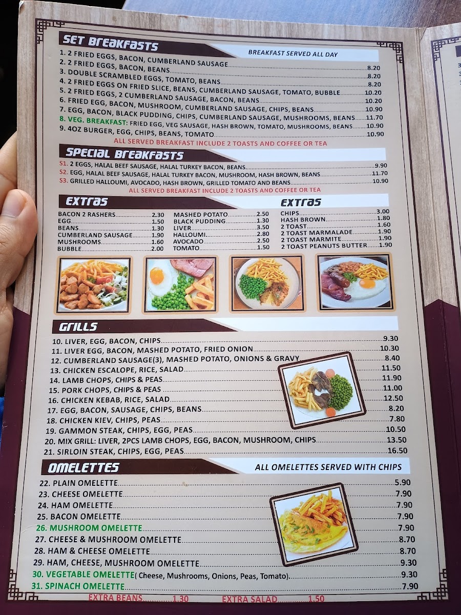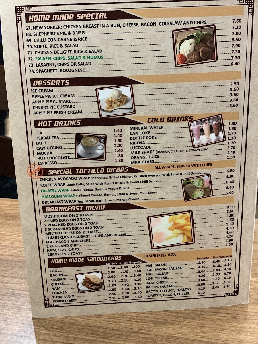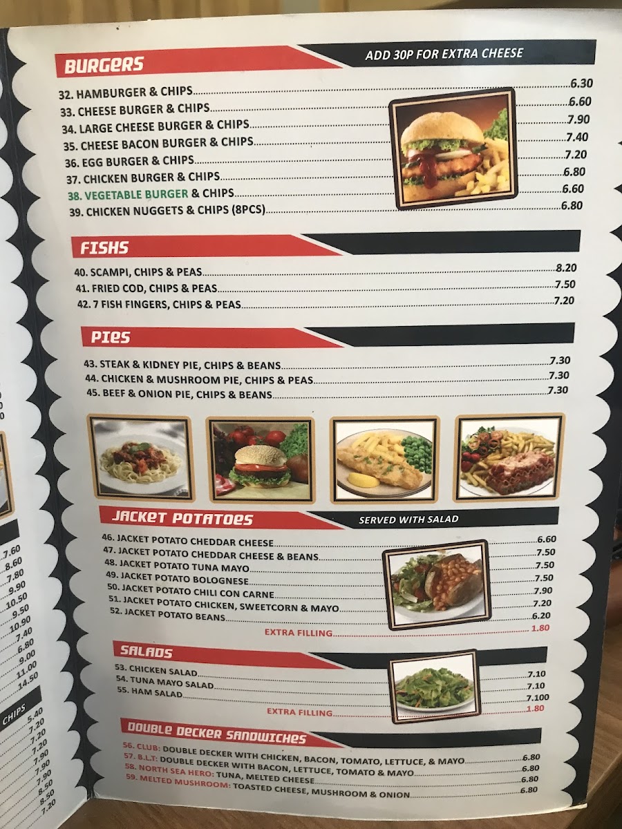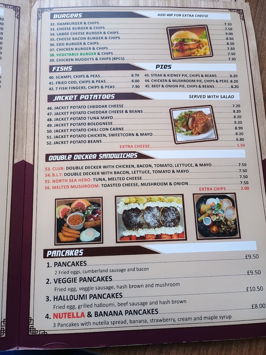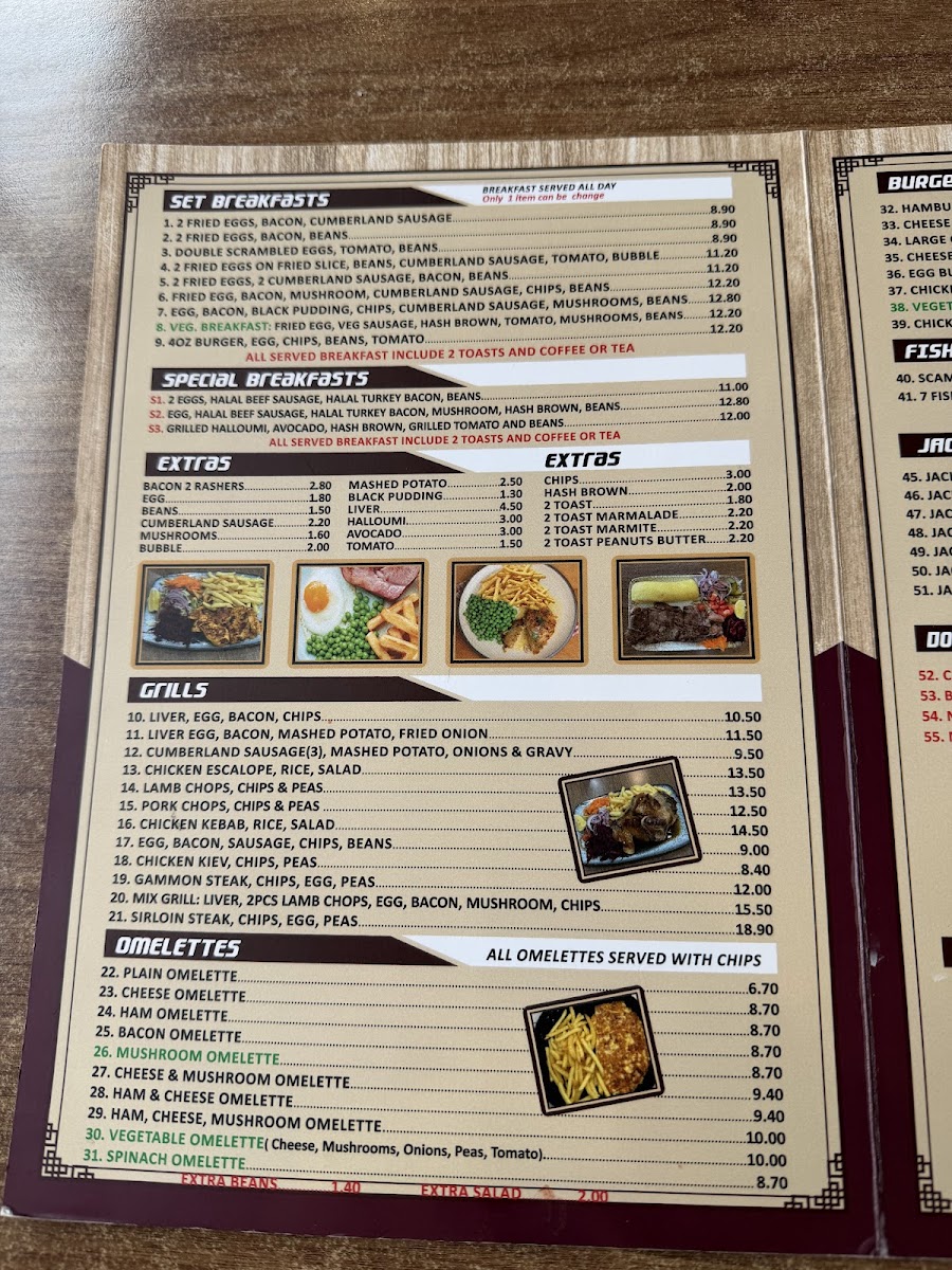 Poppins Cafe at 4 Poppin's Ct in London offers a menu that is both comforting and delightfully varied, catering to classic British tastes with a few modern twists. The burger selection is generous, featuring Hamburger & Chips, Cheese Burger & Chips, Large Cheese Burger & Chips, Cheese Bacon Burger & Chips, and Egg Burger & Chips, each promising hearty portions. Seafood lovers will enjoy the Scampi, Chips & Peas, Fried Cod, Chips & Peas, and Fish Fingers, Chips & Peas, while the Plain Omelette and Ham Salad provide lighter alternatives. For a sweeter treat, the pancake offerings are imaginative, from Pancakes and Veggie Pancakes to Halloumi Pancakes and Nutella & Banana Pancakes. The breakfast menu is extensive, with options like Mushroom On 2 Toasts, 2 Fried Eggs On 2 Toast, 3 Scrambled Eggs On 2 Toast, and Melted Cheese On 2 Toast, complemented by the variety of teas including Bacon Roll and Sausage, Mushrooms. Set breakfasts range from Fried Egg, Bacon, Mushroom, Sausage, Chips, Beans to Double Scrambled Eggs, Tomato, Beans, offering hearty morning meals. Extras such as Bacon, 2 Toast Marmalade, Black Pudding, and Beans allow for personalized touches. The grill section is equally satisfying with dishes like Liver, Egg, Bacon, Chips, Cumberland Sausage, Mashed Potato, Onions & Gravy, Chicken Escalope, Rice, Salad, and Lamb Chops, 2 Veg. Chips. Completing the menu are cold and hot beverages, from Herbal Tea, Latte, Cappuccino, Mocha, and Hot Chocolate to Mineral Water, Can Coke, Bottle Coke, Ribena, and Lucozade. Overall, the menu at Poppins Cafe balances hearty classics with versatile options, making it a welcoming spot for breakfast, lunch, or a casual snack.
